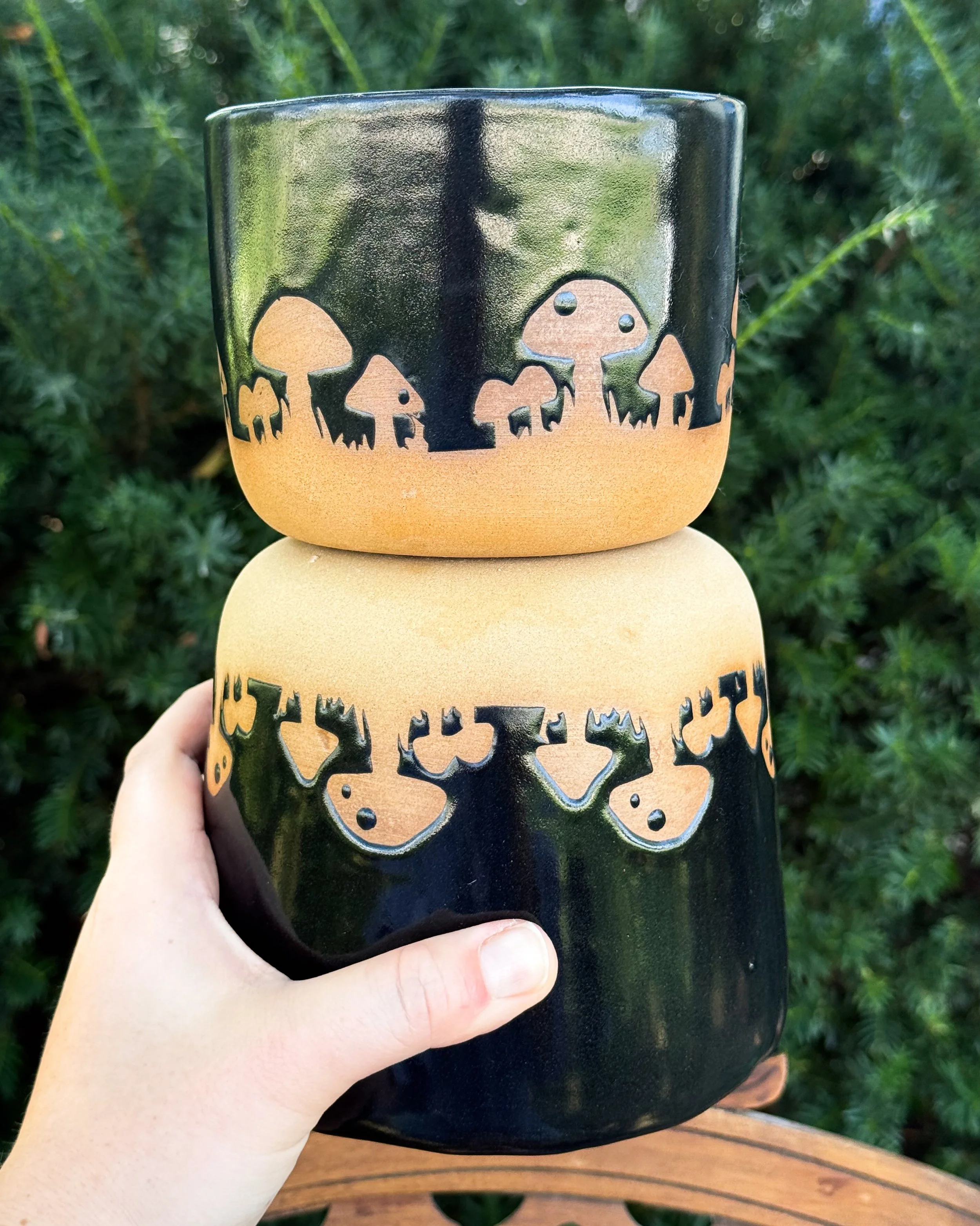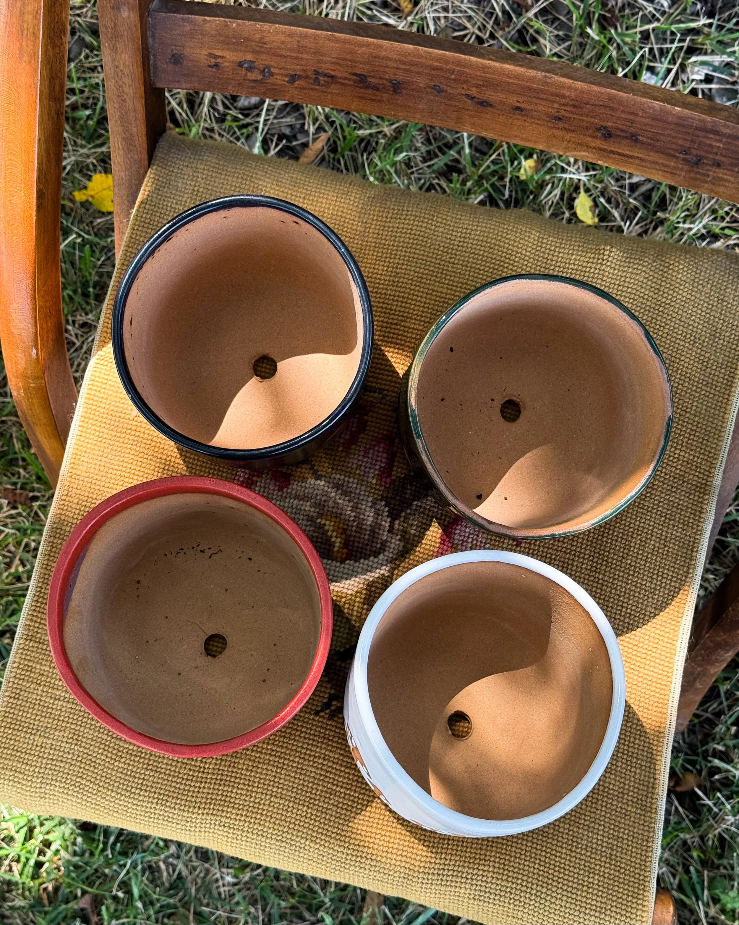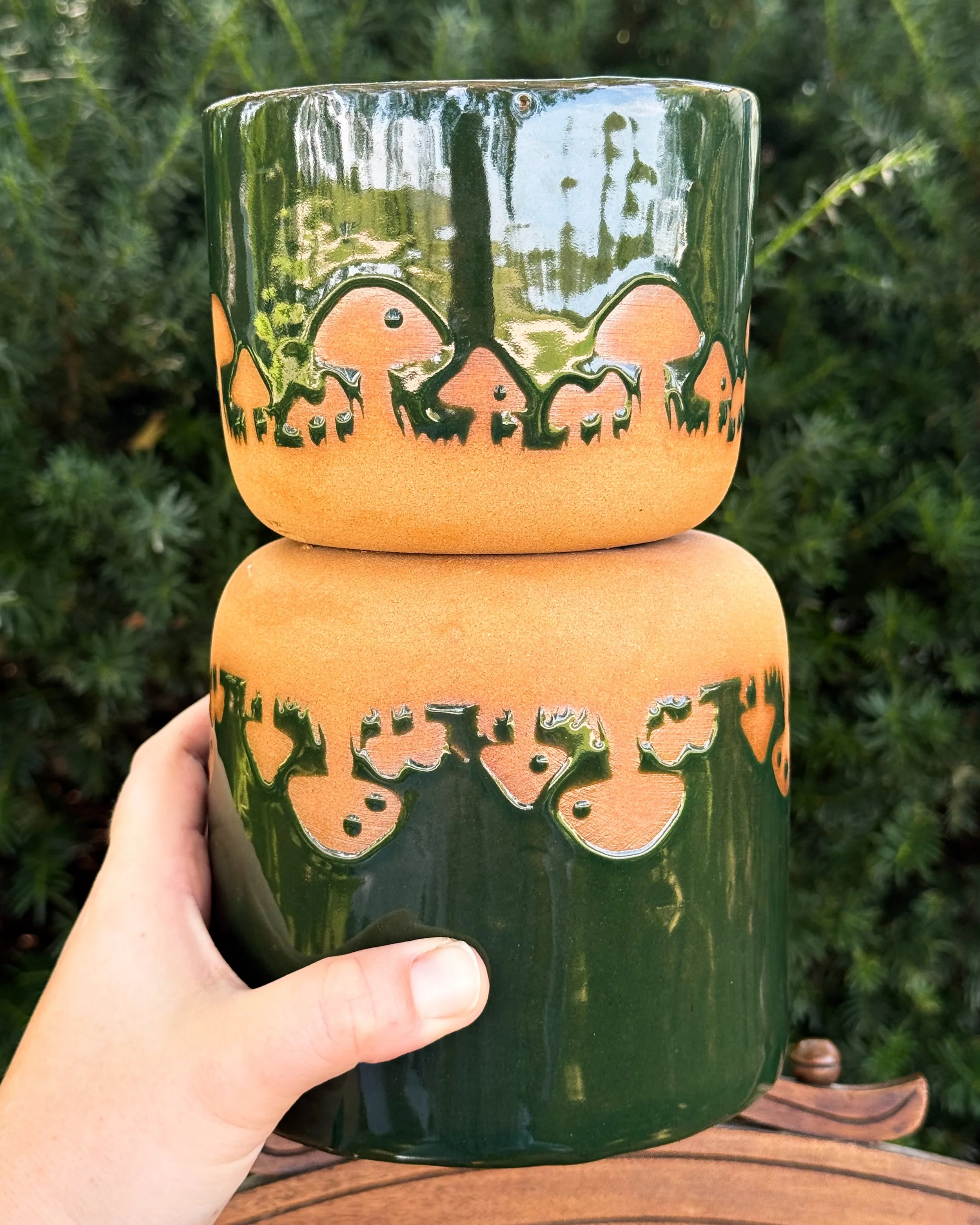 Designed intentionally without drainage holes, these cache pots fit snuggly around standard plastic nursery pots. Cache pots are the IDEAL container type for houseplants because they prevent moisture rings on furniture, and they allow you the best drainage and access to check root health via the plastic nursery pot. Interested to learn about plant care in a cache pot? Check out my YouTube episode: Plant Vessels 101.